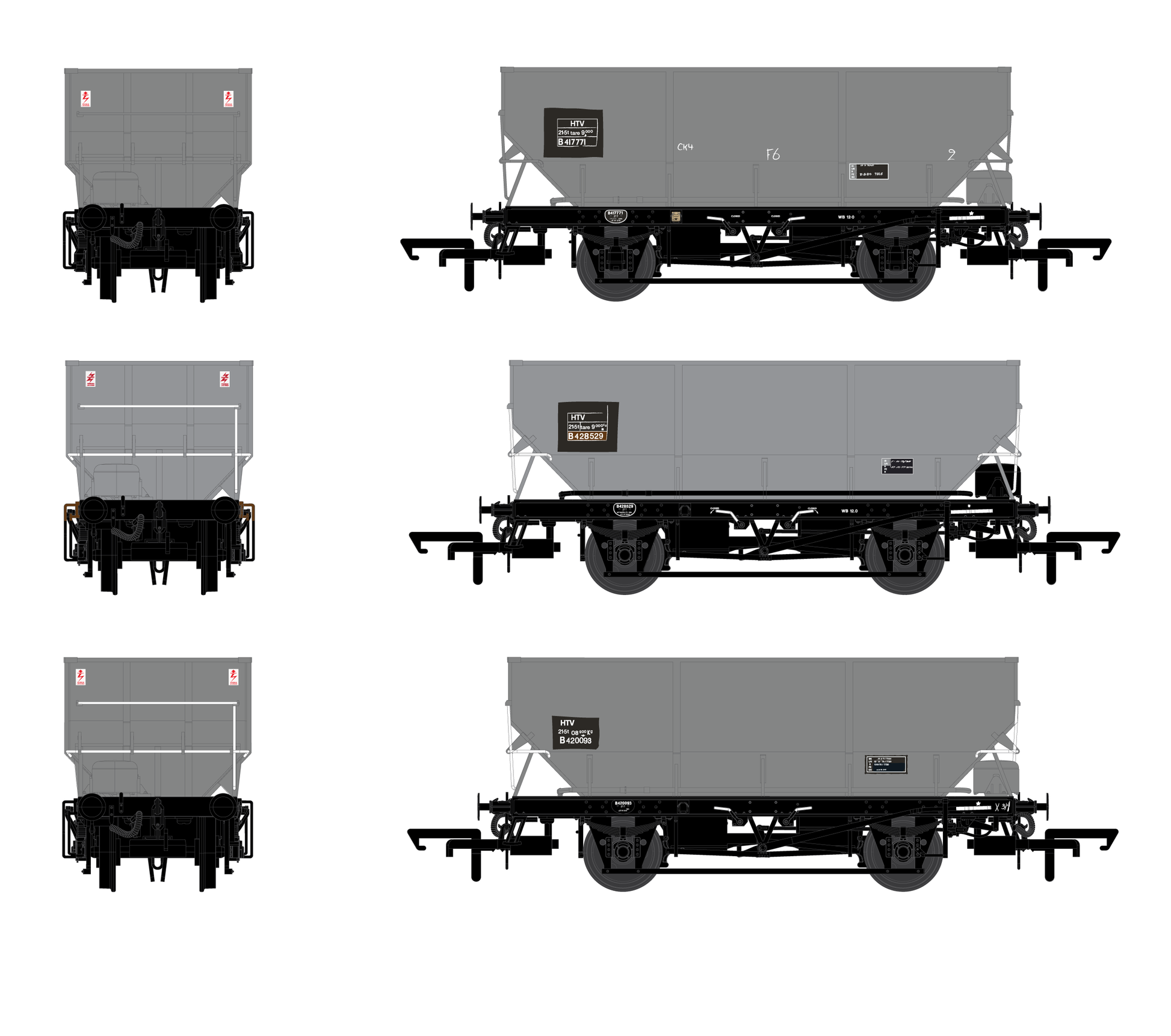 Rebuilt 2-rib body style, Vacuum brake fitted and running on roller bearing and grease axle boxes. BR grey livery with HTV markings.