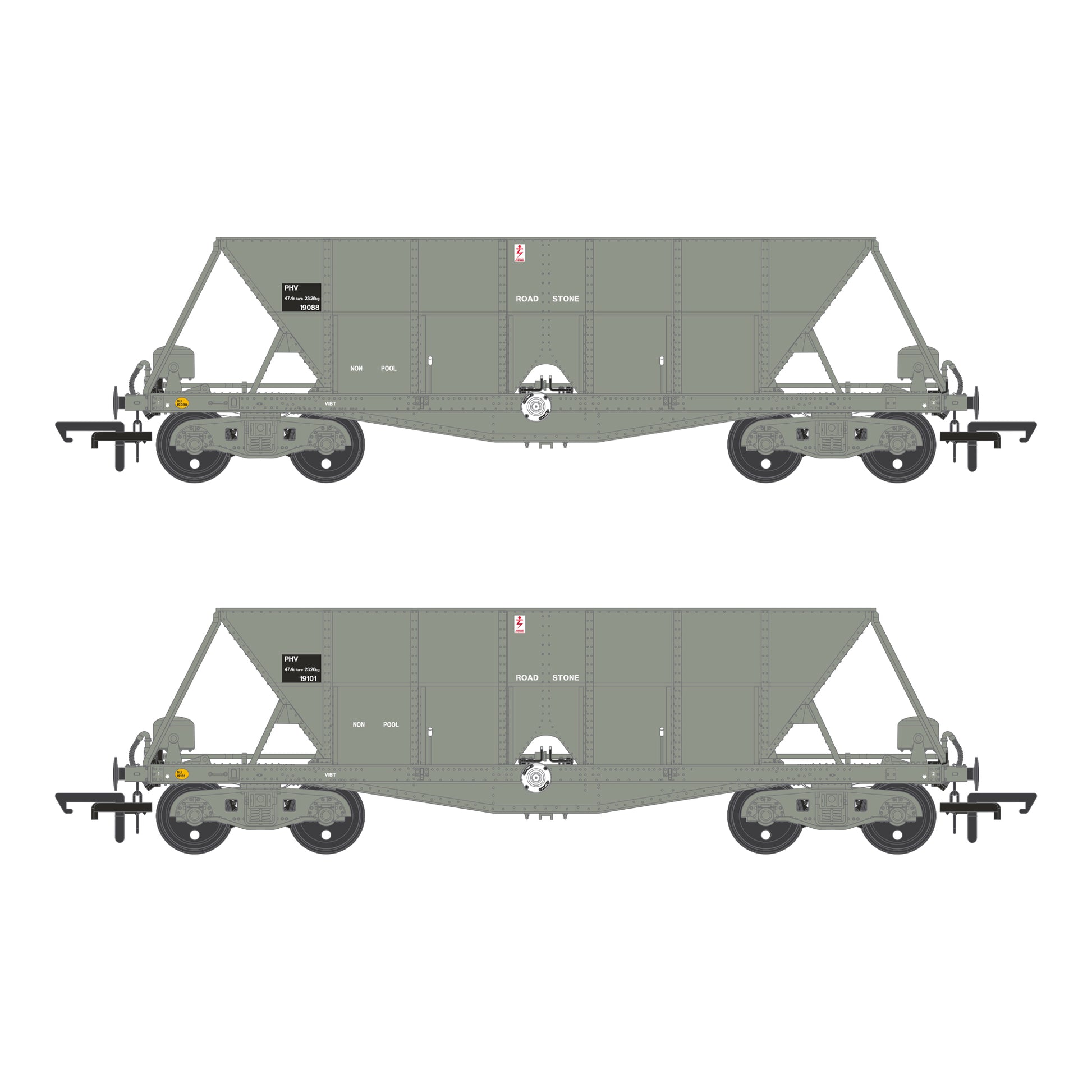 Detailed chassis and bogies, with separate vacuum brake gear, vacuum hoses, hopper door controls, handbrake wheels and brake gear.