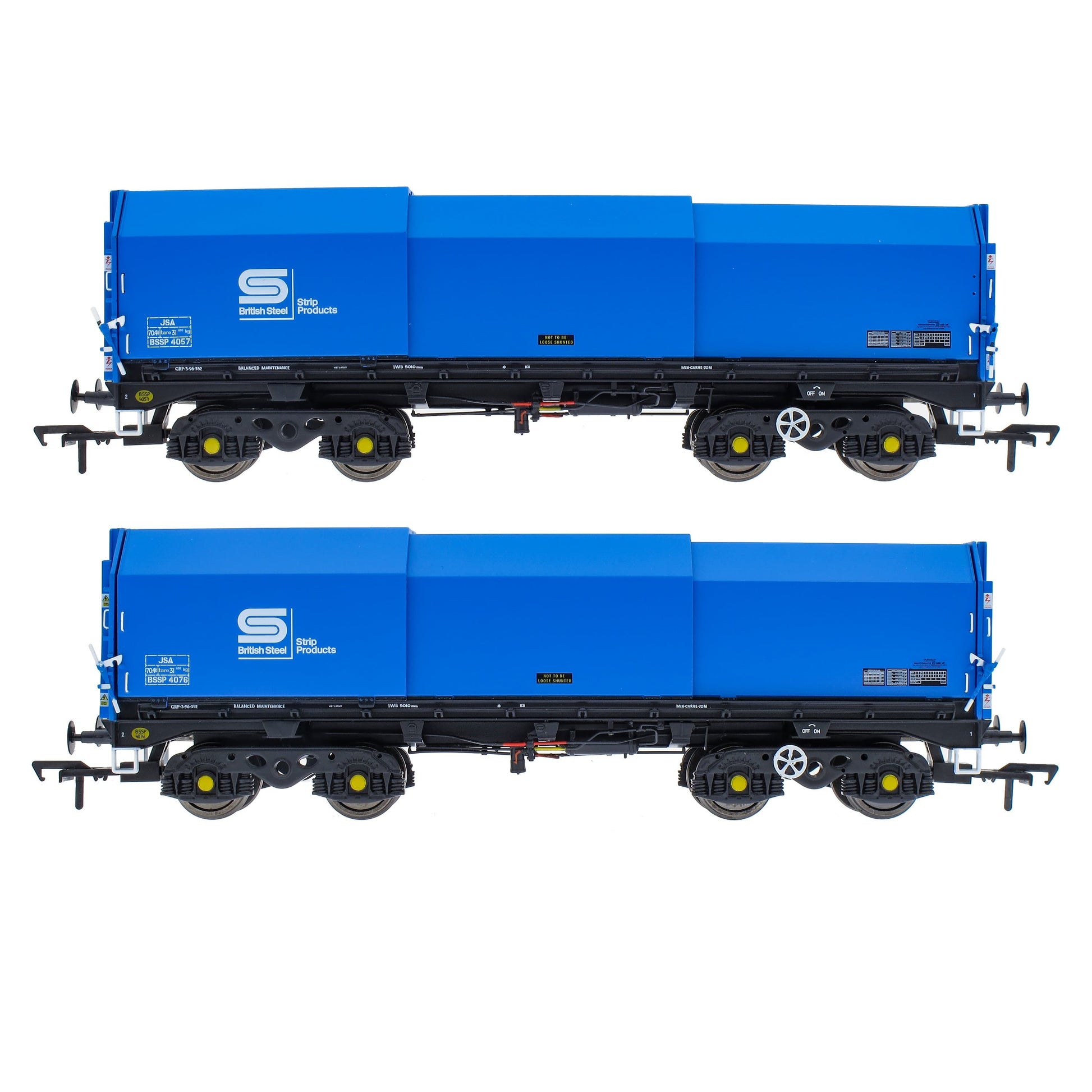 This pack contains two wagons, with posable steel plate hoods in Blue British Steel Livery: